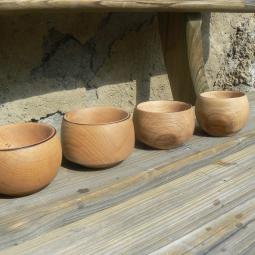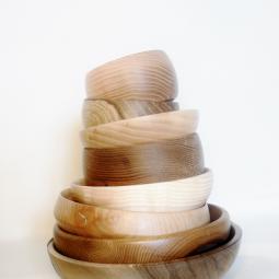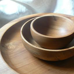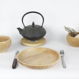 Vaisselle : assiettes en bois, bols en bois, saladiers, coupes à fruits, pillons et mortiers.